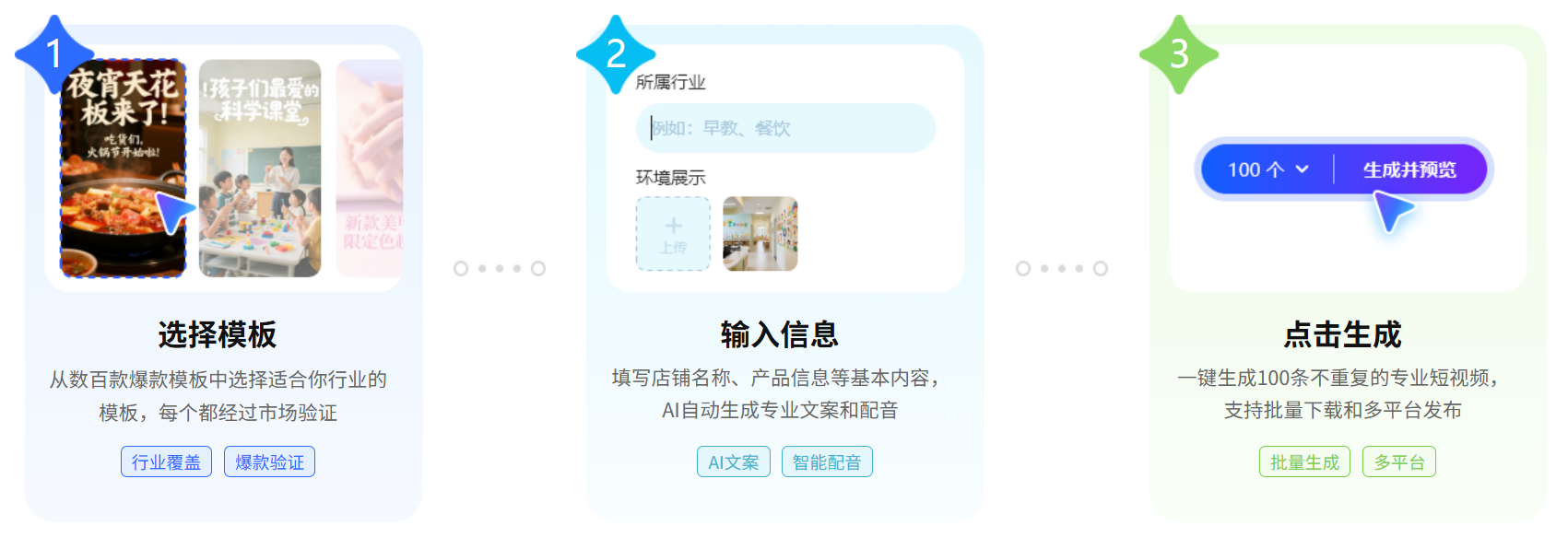 选模板→填信息→AI自动生成,只需3步即可批量产出,极大提升内容产出效率。