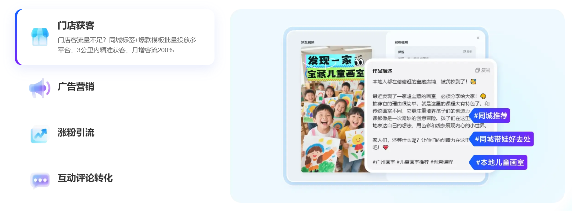 这是一个专为实体商家以及中小企业打造的AI智能内容生产平台,致力于让每个人都能轻松制作高质量、高转化的营销视频与图文笔记,让内容获客更简单!